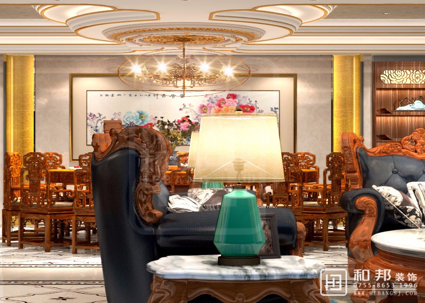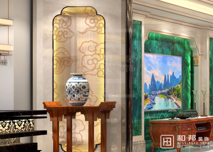 本案從孔雀綠玉石背景墻上彰顯出特意的設計質感,也造就出深淺對比,層次有序的精致風華。