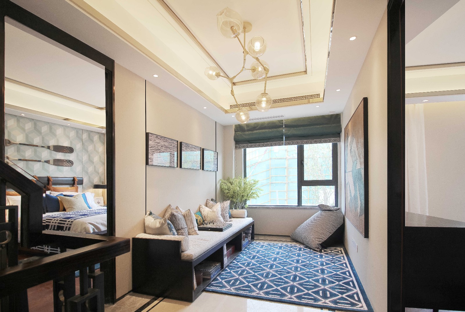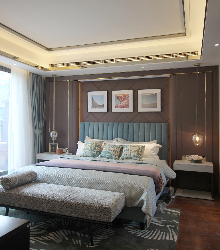 二層的長(zhǎng)輩房,同樣在一側(cè)加入了整面的自然采光玻璃墻。自然啞光與手工質(zhì)感的藍(lán)色系床品,與溫潤(rùn)的木飾面搭配。在光的作用下,材質(zhì)本身的質(zhì)感便足矣傳達(dá)出空間溫和而舒緩的氣質(zhì)了。