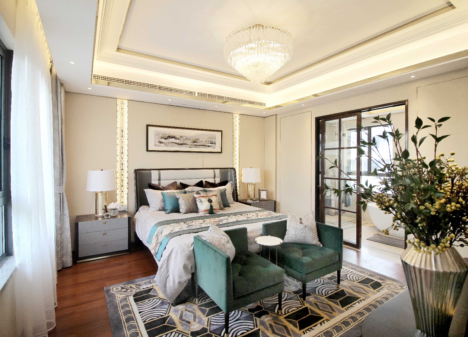 主臥延續(xù)了空間對(duì)于光的追求,皆以整面墻的落地玻璃設(shè)置使每個(gè)空間呈現(xiàn)為“對(duì)外打開(kāi)”的狀態(tài)。