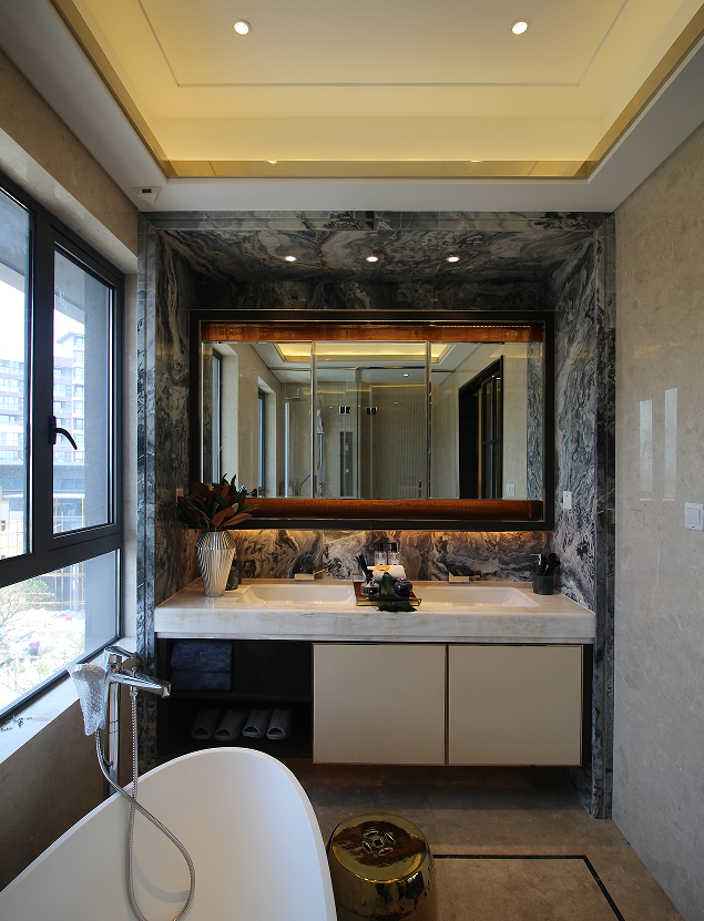 通過(guò)色彩的節(jié)奏變化,年輕感而又具有品質(zhì)的主臥空間被呈現(xiàn)了出來(lái)。主臥空間內(nèi)嵌獨(dú)立衣帽間及衛(wèi)浴空間,提升了主人對(duì)于生活品質(zhì)的追求。在吊頂?shù)瓤臻g多處,柔和的圓角造型代替了棱角的尖銳,一抹金調(diào)的點(diǎn)綴、一撇綠植的協(xié)調(diào),梳理出了偏女性化的空間之美。
